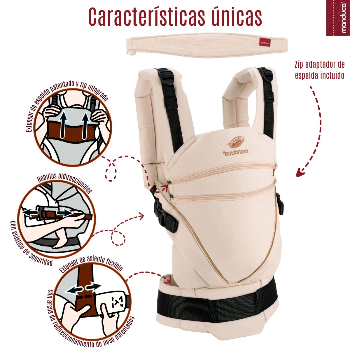 Incluye 1 asesoría gratuita de porteo por parte de la marca Manduca, garantía de 3 años (nacional e internacional) y acceso a grupo de apoyo para acompañarte en tu experiencia de porteo.