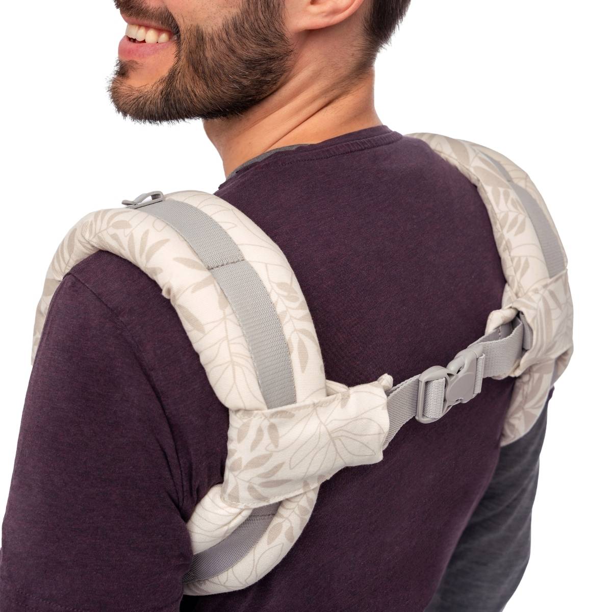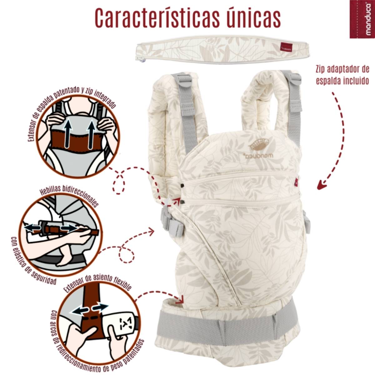 Ofrece porteo ergonómico en tres posiciones: frontal, cadera y espalda, siempre respetando la posición en “M”, recomendada por especialistas.
