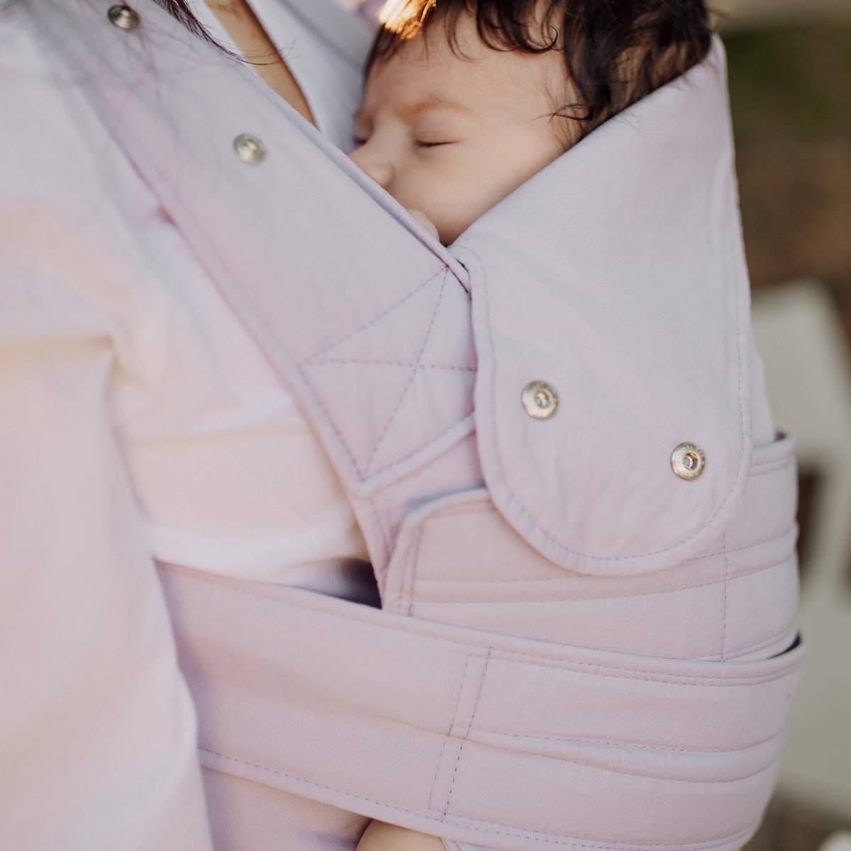 Marsupi Breeze Lilac es ternura ligera en forma de portabebé. Suavidad, frescura y comodidad para ti y tu bebé, incluso en los días más cálidos.