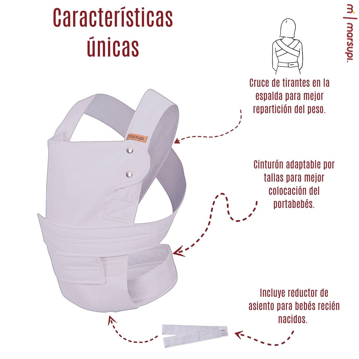 Ofrece dos posiciones de porteo: al frente y en la cadera, ambas seguras y recomendadas por especialistas en desarrollo infantil. También incluye soporte de cabeza y adaptador para recién nacidos, para que lo puedas usar desde los primeros días.