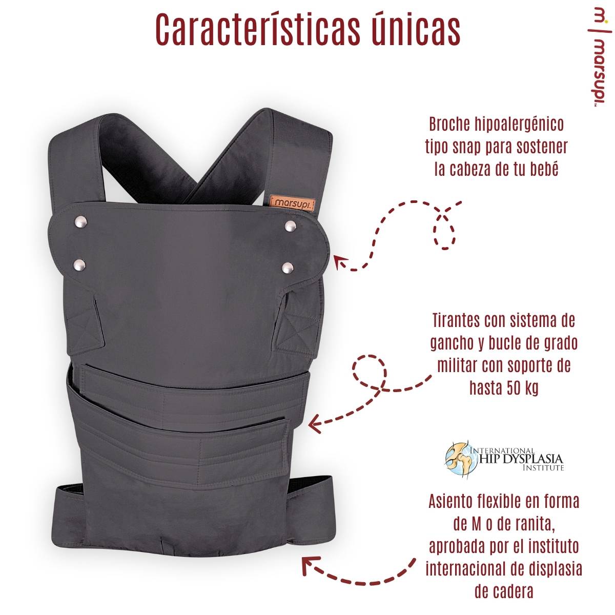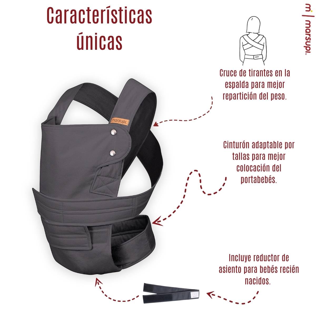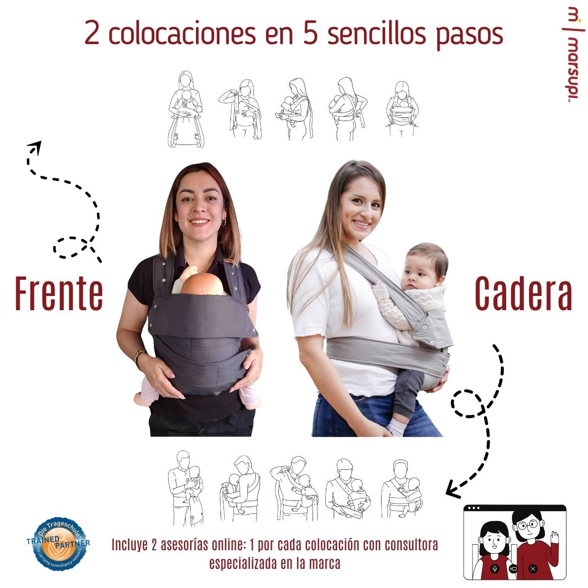 Ofrece dos posiciones de porteo: al frente y en la cadera, siempre respetando la posición ergonómica en “M”, recomendada por ortopediatras en México. Cuenta con soporte de cabeza integrado y un adaptador especial para recién nacidos, ideal para brindar mayor control durante las primeras semanas.