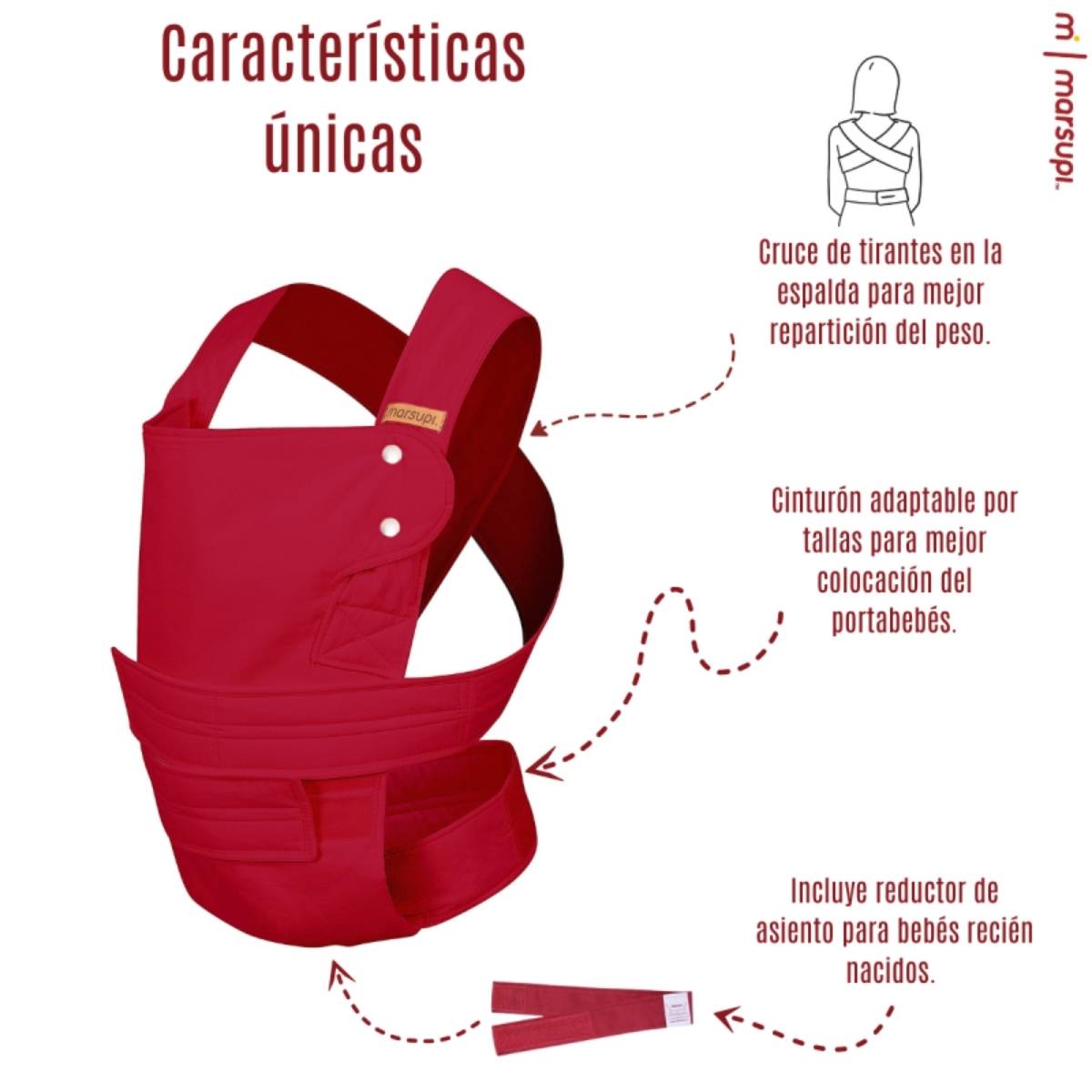 Cuenta con dos posiciones de porteo: al frente y en la cadera, ambas respetando la posición en “M” recomendada por ortopediatras en México. También incluye un soporte cefálico integrado que brinda mayor control y seguridad, especialmente para recién nacidos, así como un adaptador de recién nacido y una bolsa de transporte.