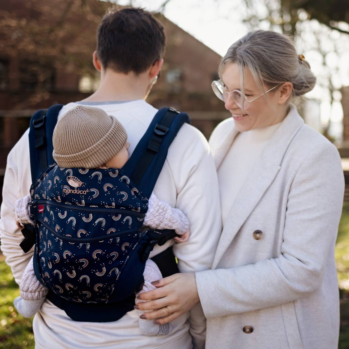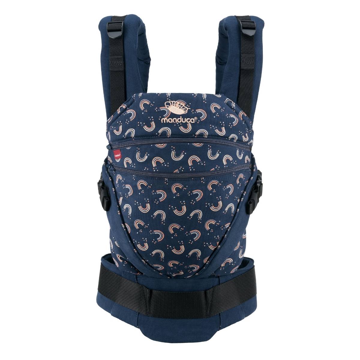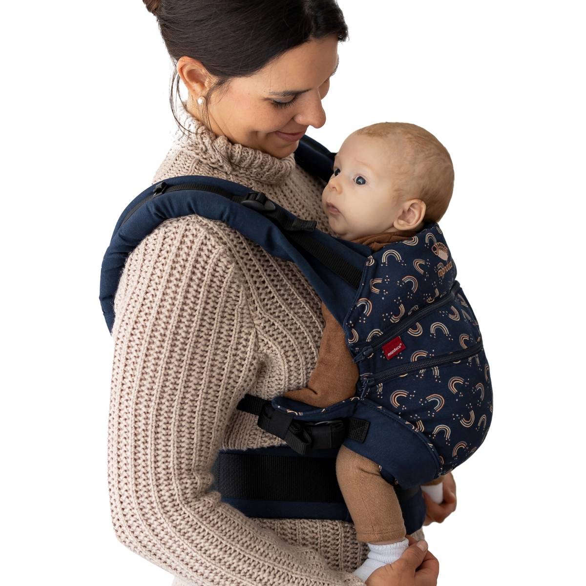 Manduca XT Edición Limitada Rainbow Night con su estampado de arcoíris sobre azul profundo representa conexión y esperanza. Un diseño que luce increíble para el porteo de mamá o papá, en cualquier estación.