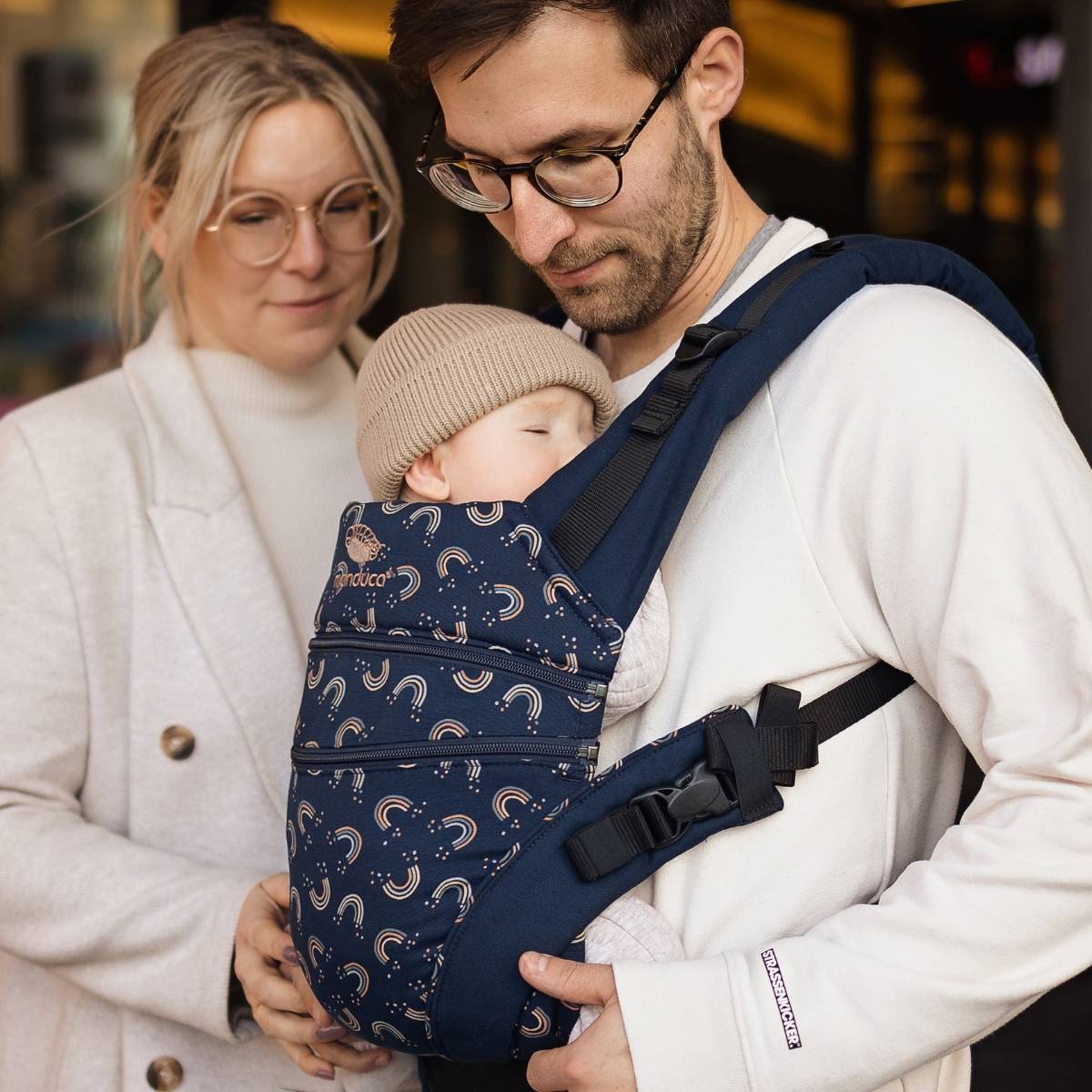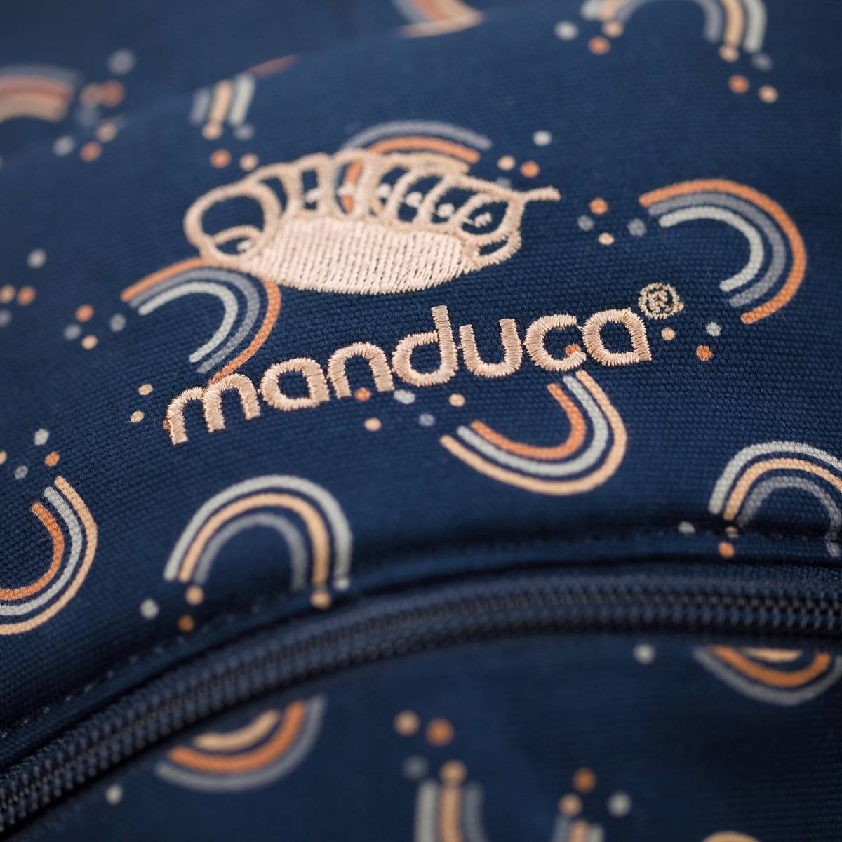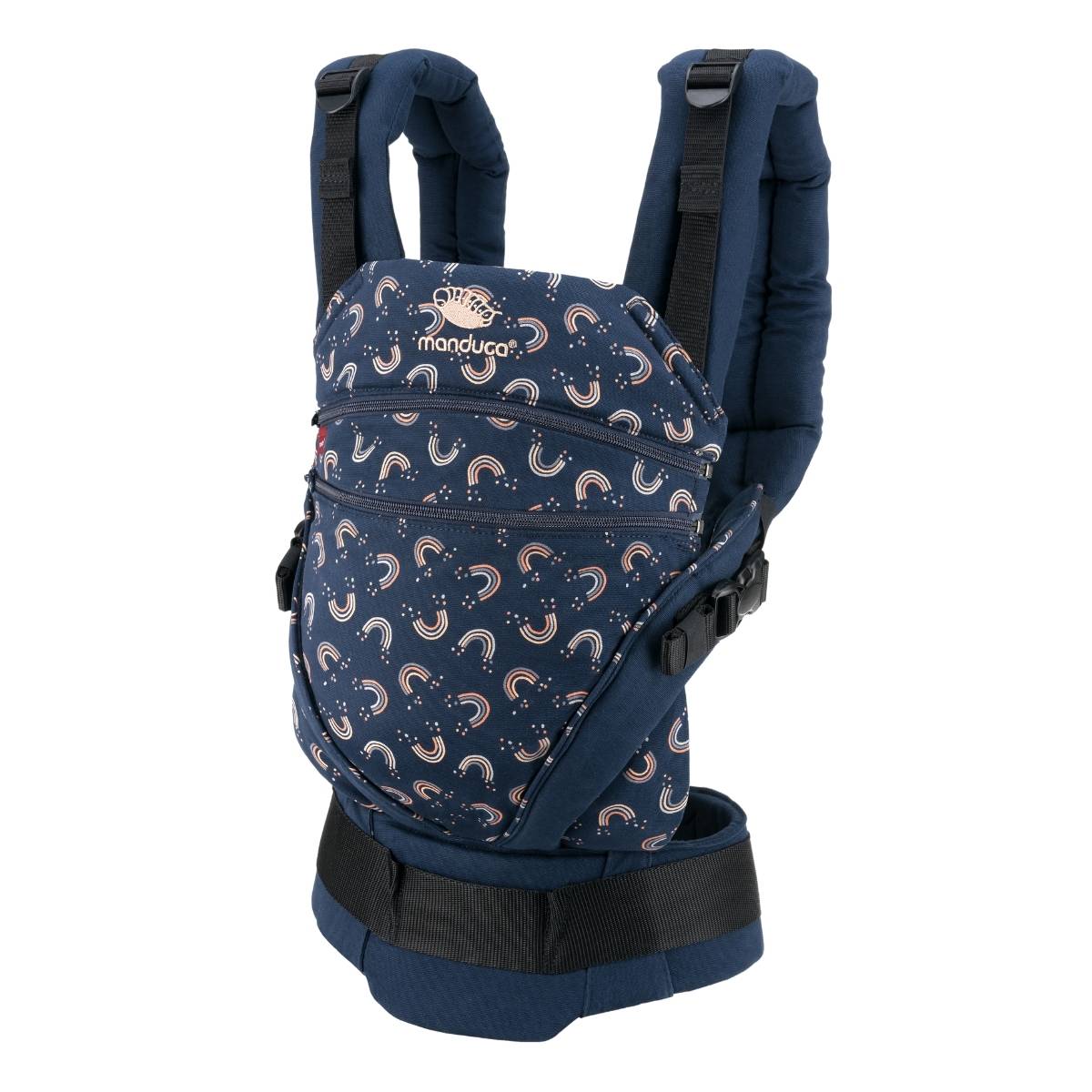 Manduca XT Edición Limitada Rainbow Night con su estampado de arcoíris sobre azul profundo representa conexión y esperanza. Un diseño que luce increíble para el porteo de mamá o papá, en cualquier estación.